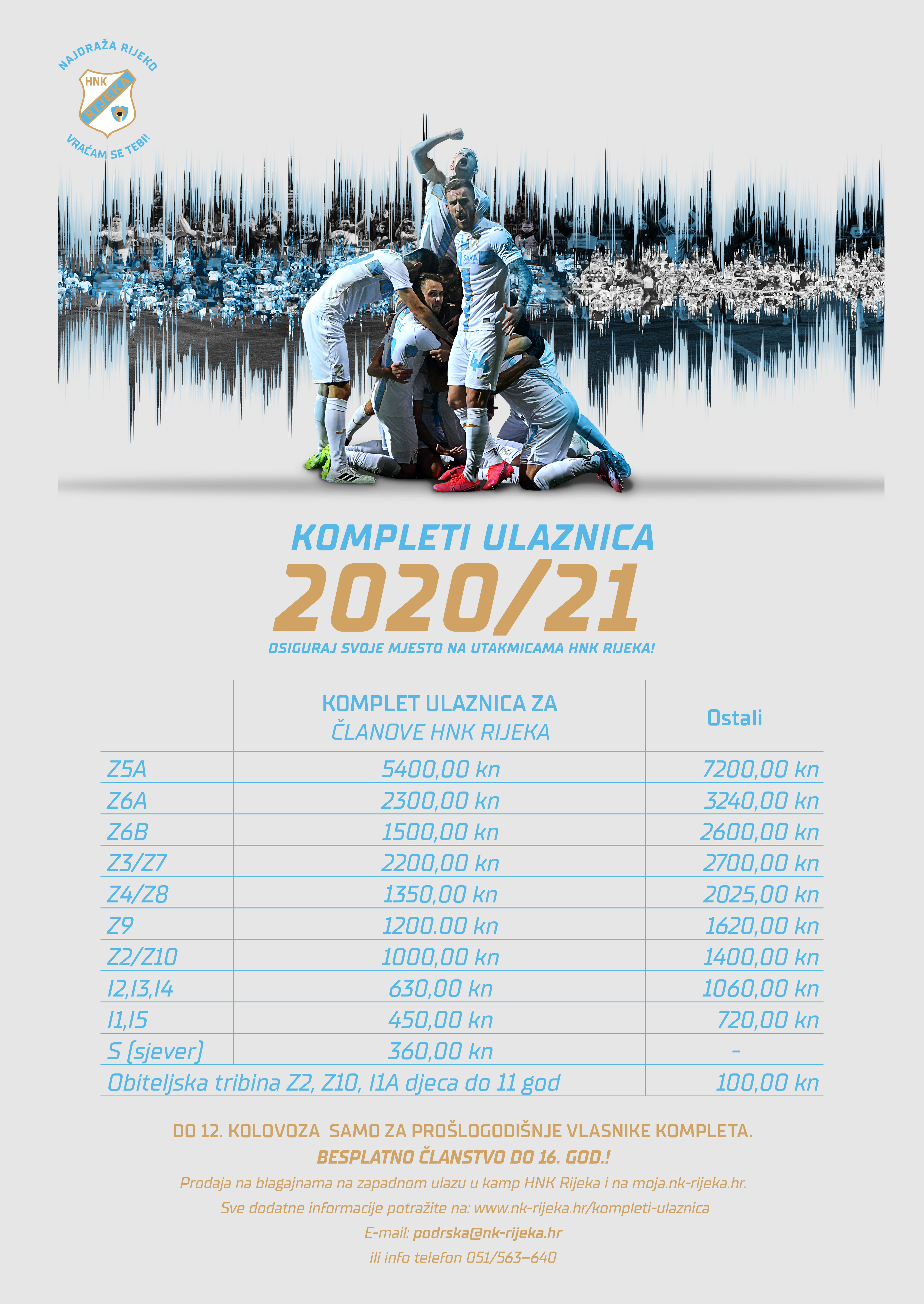 Hrvatski nogometni klub Rijeka u srijedu 12. kolovoza počinje s prodajom kompleta ulaznica za sezonu 2020./2021.