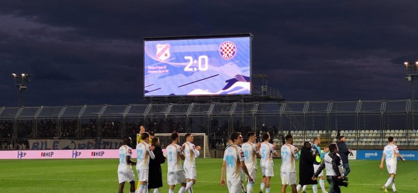 Nogometaši Rijeke pobijedili su Hajduk 2:0 u utakmici 29. kola SuperSport HNL-a.Rijeka je stigla do važna tri boda koja su donijela skok na treće mjesto.Igrala se 75. minuta. Banda je sjajno proigrao Grgića koji je oštro ubacio s desne strane, a Marin ljevicom poentirao na drugoj vratnici – 2:0!Bio je to trenutak koji je prelomio utakmicu, Hajduk je ostao bez prilika završnici, a Rijeka je mogla povećati vodstvo.U 89. minuti Janković je ubacio, Banda je pucao preko gola. Minutu kasnije Hodža je proigrao Grgića koji je prevario braniča, ali Awaziem je blokirao udarac.Utakmica je ponudila oprezno otvaranje s obje strane. Nakon uvodnog ispitivanja snaga, prva prilika bila je ujedno i gol. Marin i Vukčević odigrali su dupli pas na lijevoj strani. Vukčević je ubacio, a Frigan sjajno poentirao glavom – 1:0!Deset minuta kasnije Marin je izveo korner, Dilaver je odlično pokušao škaricama, ali lopta je otišla pored gola.U 22. minuti nova prilika za Rijeku. Prince je ubacio oštro u pet metara, malo je nedostajalo da Frigan pospremi loptu u mrežu.Hajduk je prvo poluvrijeme imao u 25. minuti.Prva prilika za Hajduk. Nakon ubačaj Lovrencsicsa, Pukstas se našao u odličnoj situaciji, ali udarac je išao ravno u Labrovića.Kako je odmicalo prvo poluvrijeme Hajduk je preuzimao kontrolu, Rijeka je u dva navrata očistila opasnost.U 39. minuti slobodan udarac za Hajduk na 18 metara nakon prekršaja nad Kalinićem. Fossati je potegnuo, lopta se odbila od živog zida. Fossati je snažno potegnuo iz odbijanca i “nokautirao” Hodžu loptom.Hajduk je krenuo s pritiskom u nastavku. U 49. minuti Dilaver je vratio Labroviću koji se našao u teškoj situaciji. Vratar Rijeke izbio je loptu koju je blokirao Pukstas, ali srećom odbijanac je otišao pored gola.Rijeka je odgovorila u 53. minuti. Hodža je povukao kontru i proigrao Marina koji je pucao s 15 metara, ali Lučić je obranio udarac.Bijeli su mogli prelomiti utakmicu u 56. minuti. Vušković je pogriješio i izgubio loptu, Frigan je pokupio loptu i krenuo sam prema golu, ali njegov udarac obranio je Lučić!Dvije minute kasnije Prince je uzeo loptu i gurnuo za Jankovića, ali udarac sa 16 metara od bloka je otišao u korner.Riječki pritisak kulminirao je u 59. minuti. Frigan je izveo korner, Galešić je prebacio loptu, a Vukčević na drugoj vratnici nije dobro zahvatio loptu glavom.Hajduk je najveću priliku imao u 66. minuti. Nakon ubačaja s desne strane, Benrahou je snažno potegnuo, Labrović je sjajnom reakcijom zaustavio udarac.Gosti su zatresli mrežu u 70. minuti, nakon jednog odbijanca, Pukstas je ostao sam i poentirao. Gol je poništen zbog zaleđa Awaziema.