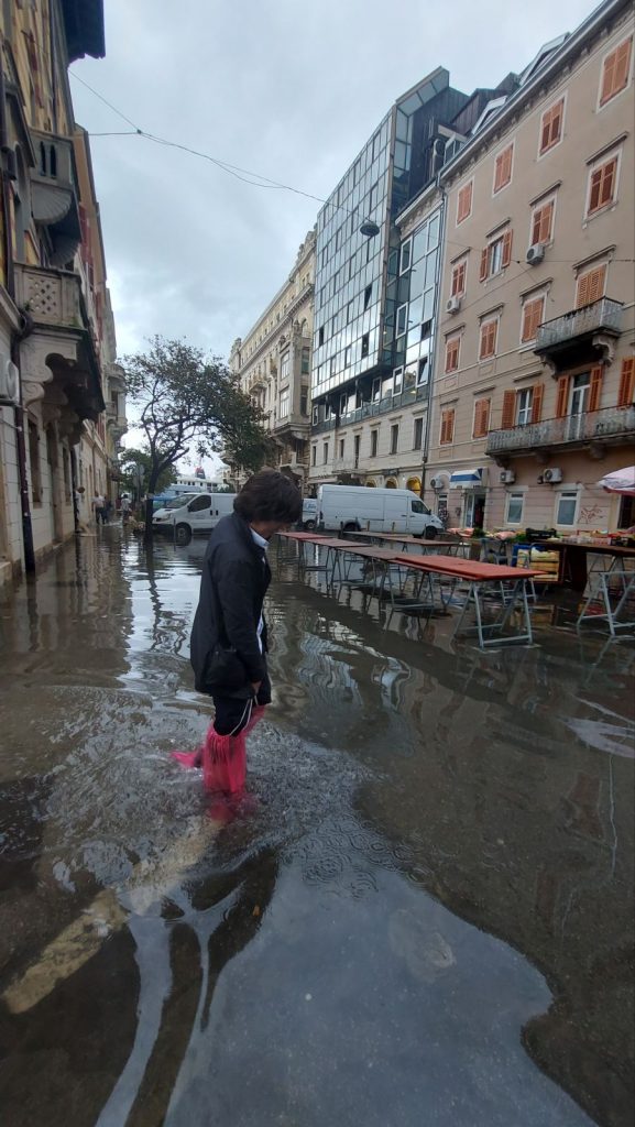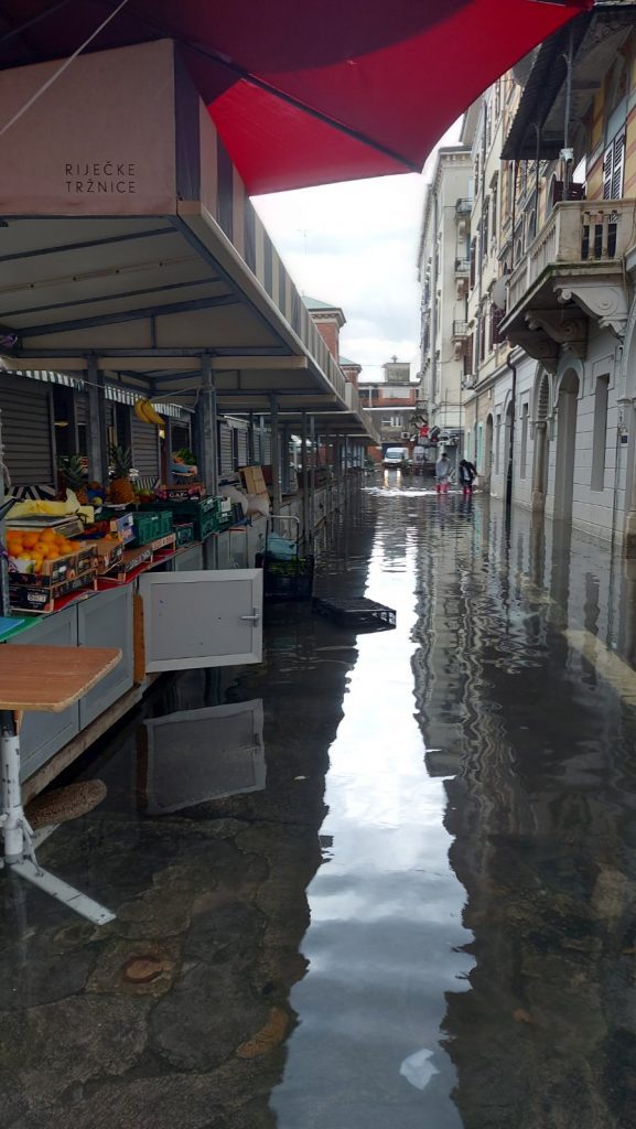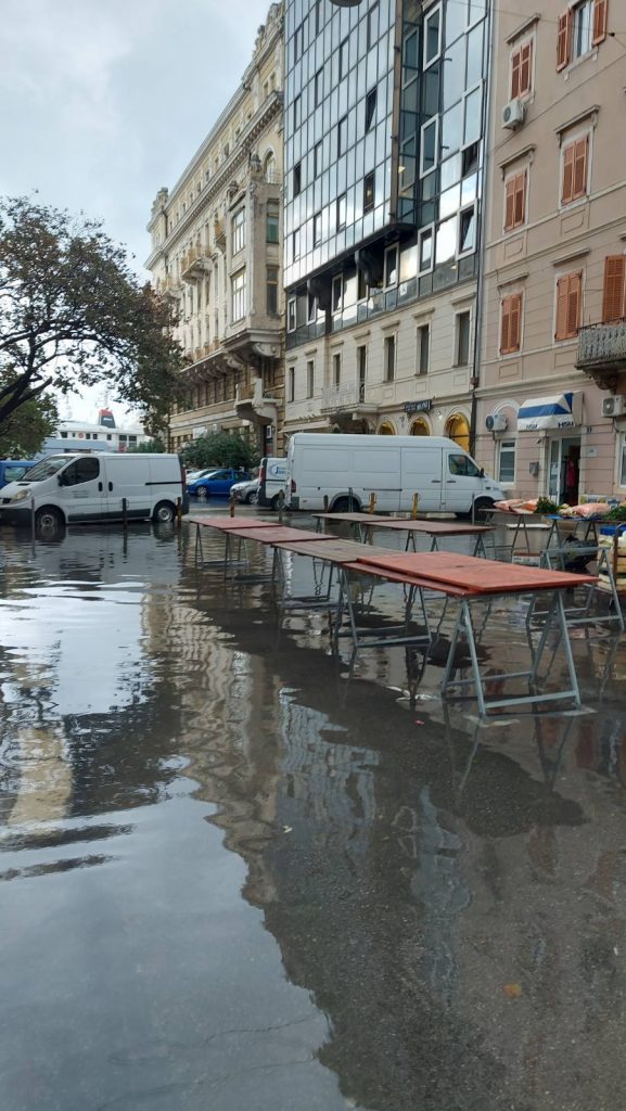 Korištenje terasa je onemogućeno, a mnogi ugostitelji ulaz vode u prostore lokala pokušavaju spriječiti postavljanjem vreća i sličnih prepreka. Nesvakidašnji prizori i na rivi ,razina mora preplavila je Gat Karoline Riječke.
