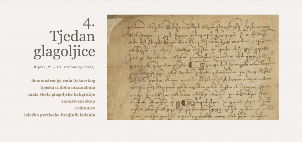 Dana 8. studenoga na Filozofskom fakultetu u Rijeci, s početkom u 10:00 sati, održat će se znanstveni skup “Kurzivna glagoljica na riječkom i zadarskom području”. Na skupu će predavanja održati naši najeminentniji stručnjaci. Program skupa nalazi se na mrežnom mjestu: www.benja.hr. Ostali dani Tjedna glagoljice posvećeni su raznim programima i radionicama koji će se odvijati u Palači šećera .