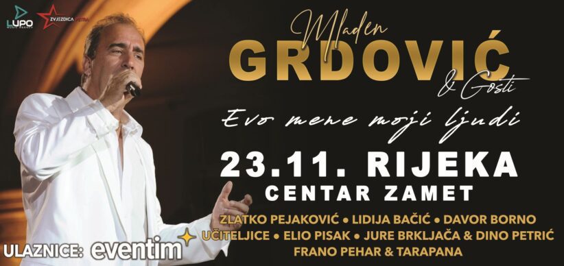 U sklopu slavljeničke turneje „Evo mene moji ljudi“ kojom slavi 45 godina karijere, Mladen Grdović 23. studenog stiže u Rijeku, gdje će u Centru Zamet održati veliki koncert, s početkom u 20 sati. Legenda hrvatske zabavne glazbe i dalmatinske pisme svojim riječkim fanovima priprema noć za pamćenje, a na sceni će mu se pridružiti i posebni gosti – Zlatko Pejaković, Lidija Bačić, Davor Borno, Elio Pisak, Učiteljice, Jure Brkljača i Dino Petrić i konačno, Frano Pehar i Tarapana! Grdović je aktualnu slavljeničku turneju započeo 5. listopada koncertom na splitskim Gripama, a uz koncert u Rijeci, očekuje ga još i veliki koncert u Karlovcu 15. studenog i Čakovcu 30. studenog.Mladen Grdović je kroz godine svojoj vjernoj publici darovao niz bezvremenskih i nezaboravnih hitova koje vole sve generacije publike. Pjesme kao što su „Evo mene moji ljudi”, „Dalmatinac sam”, „Nije u šoldima sve”, „Oči boje lavande”, „Tu je moj dom”, „Bolje živim nego ministar”, „Sve za ljubav”, „Bacit ću mandolinu” i mnoge druge, ispisale su povijest hrvatske zabavne glazbe, a sve će ih publika imati priliku čuti na velikom koncertu u Rijeci 23. studenog. Naravno, na repertoaru će se naći i njegov aktualni hit „Sveta Zemlja Dalmatina“ i brojne druge uspješnice koje pjevaju o Mladenovoj voljenoj Dalmaciji, plavom moru i ljubavi. Ulaznice za koncert Mladena Grdovića 23. studenog u Rijeci mogu se kupiti u Rijeci na prodajnim mjestima u Dallas Shopu Rijeka, svim lokacijama BP Petrola i Tiska, te online u sustavu Eventima, a uz online prodaju, ulaznice se mogu kupiti i na ostalim ovlaštenim prodajnim mjestima mreže Eventima.