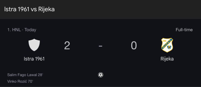 Rijeka je u 30. kolu SuperSport HNL-a doživjela poraz od Istre 1961 rezultatom 2:0 u Puli, no unatoč slaboj igri i činjenici da nisu uputili nijedan udarac na gol u prvom poluvremenu, zadržali su prvo mjesto na ljestvici.