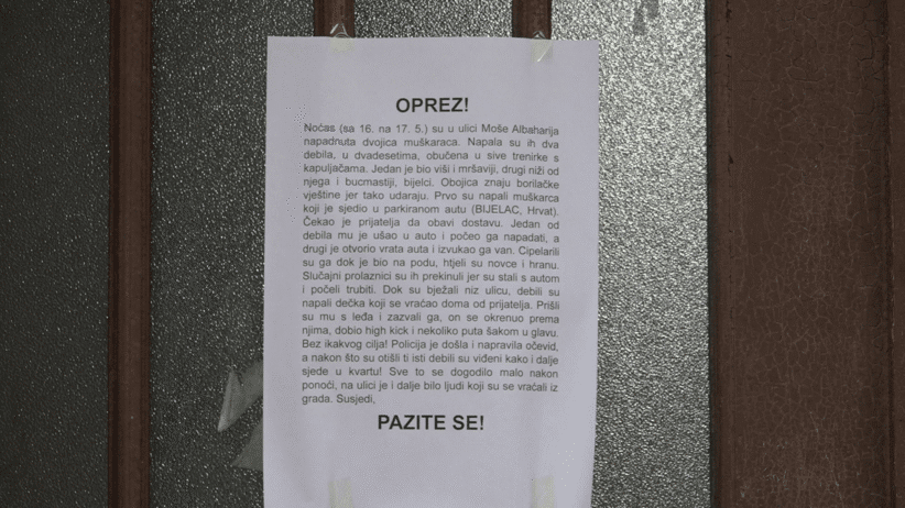 “Policija je oko ponoći 17. svibnja zaprimila dojavu o fizičkom napadu na dvojicu hrvatskih državljana u ulici Moše Albaharija. Dolaskom policijskih službenika na mjesto događaja počinitelji nisu zatečeni te je u tijeku kriminalističko istraživanje radi pronalaska istih i utvrđivanja svih relevantnih činjenica.