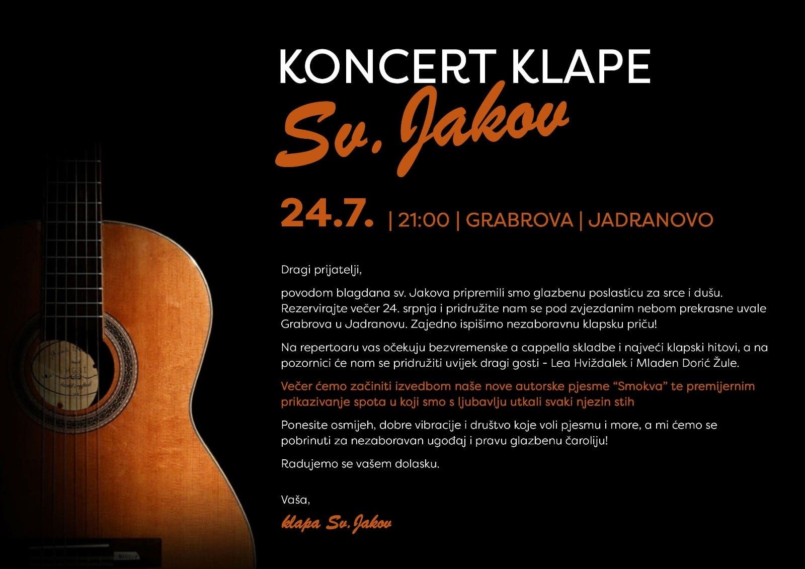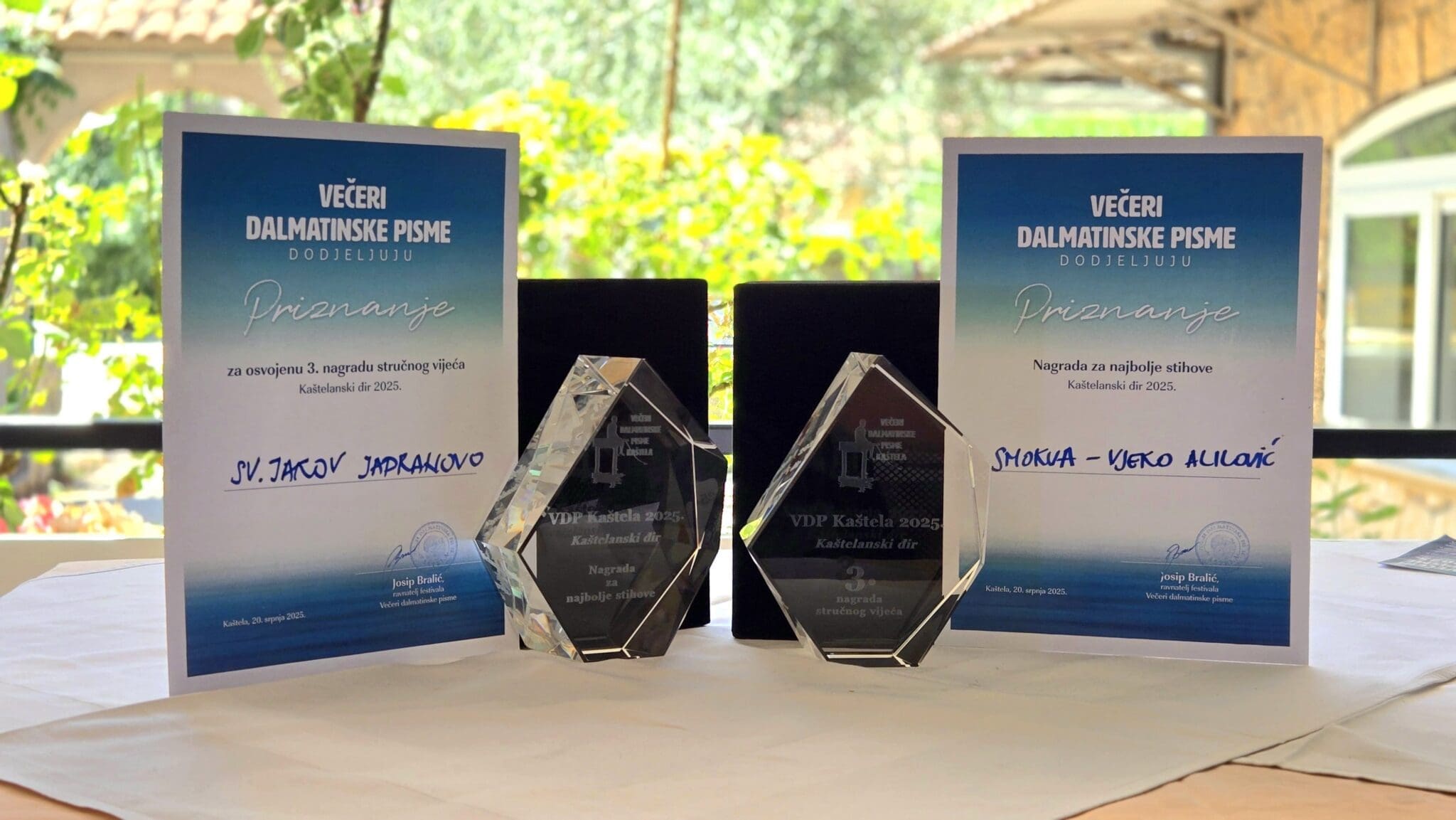 Sinoć je, među odabranima, po drugi put na festivalu nastupala klapa Sveti Jakov Jadranovo koja je sjajno predstavila kvarnersku klapsku pjesmu, a nakon prošlogodišnje nagrade za najbolji tekst (Vjeko Alilović za skladbu „Barba Jere“) ove godine se kući vratila čak sa dvije nagrade. Klapa je nastupila sa skladbom „Smokva“ koju potpisuju Bruno Krajcar kao skladatelj, Vjeko Alilović kao autor teksta, dok aranžman potpisuje voditelj klape Frane Frleta.