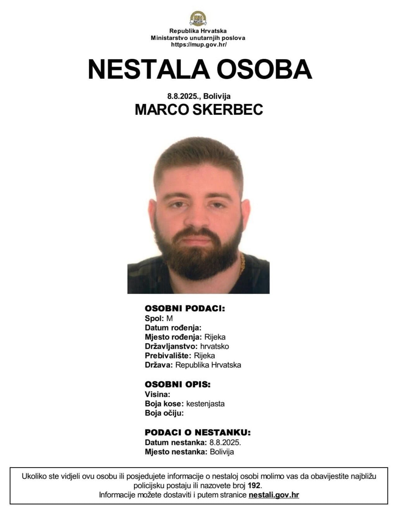 Marco Skerbec nestao je u Južnoj Americi, objavljeno je na stranicama Nacionalne evidencije nestalih osoba. Iako mu je prebivalište u Rijeci, boravi već duže vrijeme u Boliviji, a nestanak je prijavljen u PU primorsko-goranskoj.